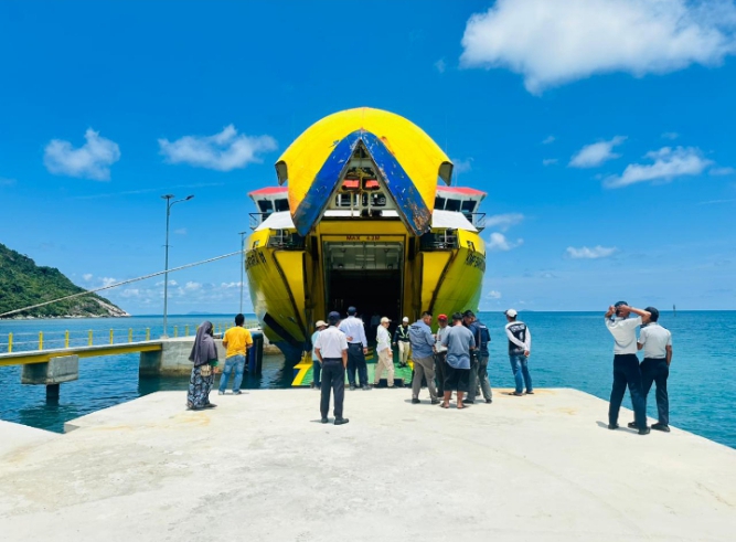 matanuansa.com – KMP BAHTERA NUSANTARA 01 Kapal Roro (roll on-roll off) KMP BAHTERA NUSANTARA 01 uji sandar perdana di Pelabuhan Pikuk Kuala Maras Jemaja Timur Minggu (21/9) siang.